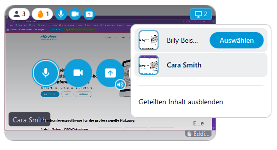 Sobald eine Bildschirmübertragung aktiv ist, erscheint in der oberen rechten Ecke des Minifensters das Bildschirmsymbol. Wenn mehrere Personen gleichzeitig Inhalte teilen, können Sie auswählen, welche Übertragung Ihnen angezeigt wird.