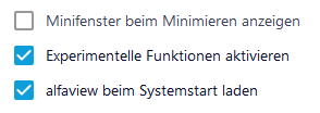 Screenshot der Einstellungen: Option "Minifenster beim Minimieren anzeigen" in den Einstellungen von alfaview ist nicht ausgewählt.