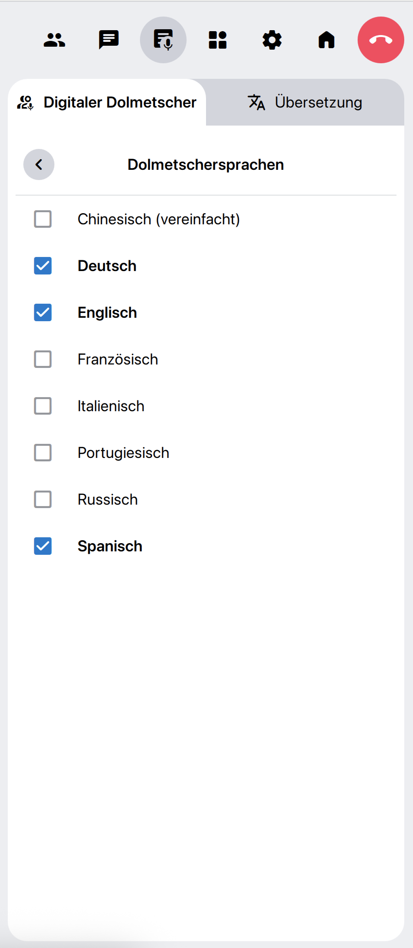 Die Auswahl der gesprochenen Sprache erscheint am oberen Rand des Reiters Digitaler Dolmetscher. Sie können diese Auswahl jederzeit ändern: