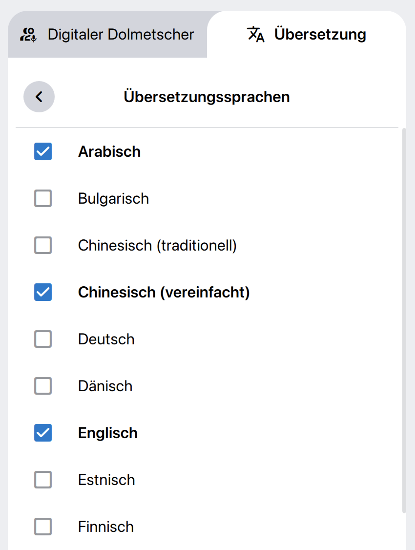 Sie können bis zu drei Sprachen gleichzeitig auswählen. Diese Übersetzungssprachen können sowohl für die Übersetzung der Live-Transkription als auch für den digitalen Dolmetscher verwendet werden.
