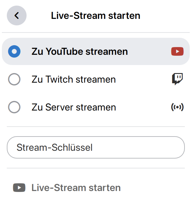 • Wählen Sie aus, zu welcher Plattform Sie streamen wollen.