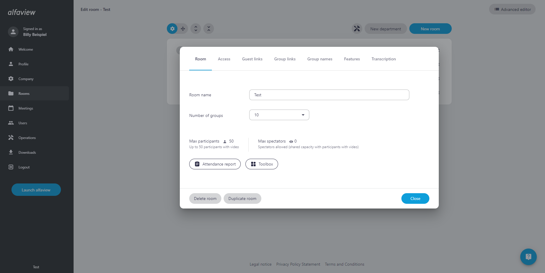 Visit the Room features page for an overview of all the features you can set for each alfaview room.