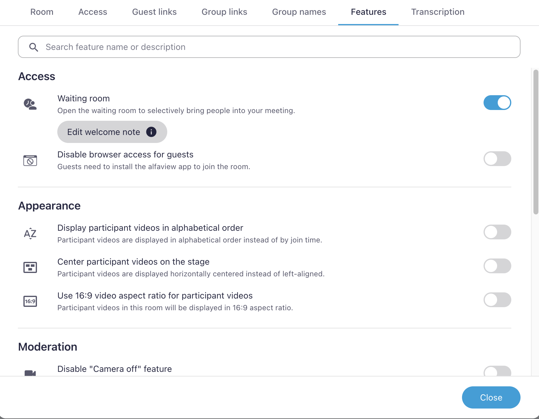 The features are grouped into four categories: Access, Appearance, Moderation and Recording. Use the search bar to find features.