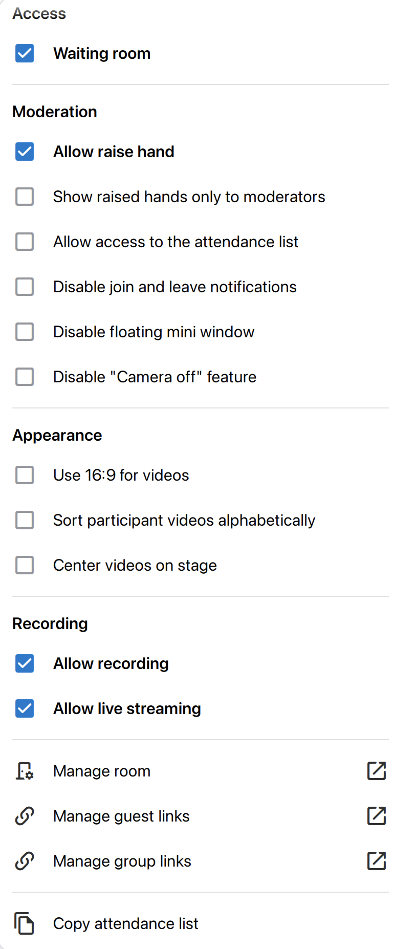 The features are grouped into four categories: Access, Appearance, Moderation and Recording. Use the search bar to find features.