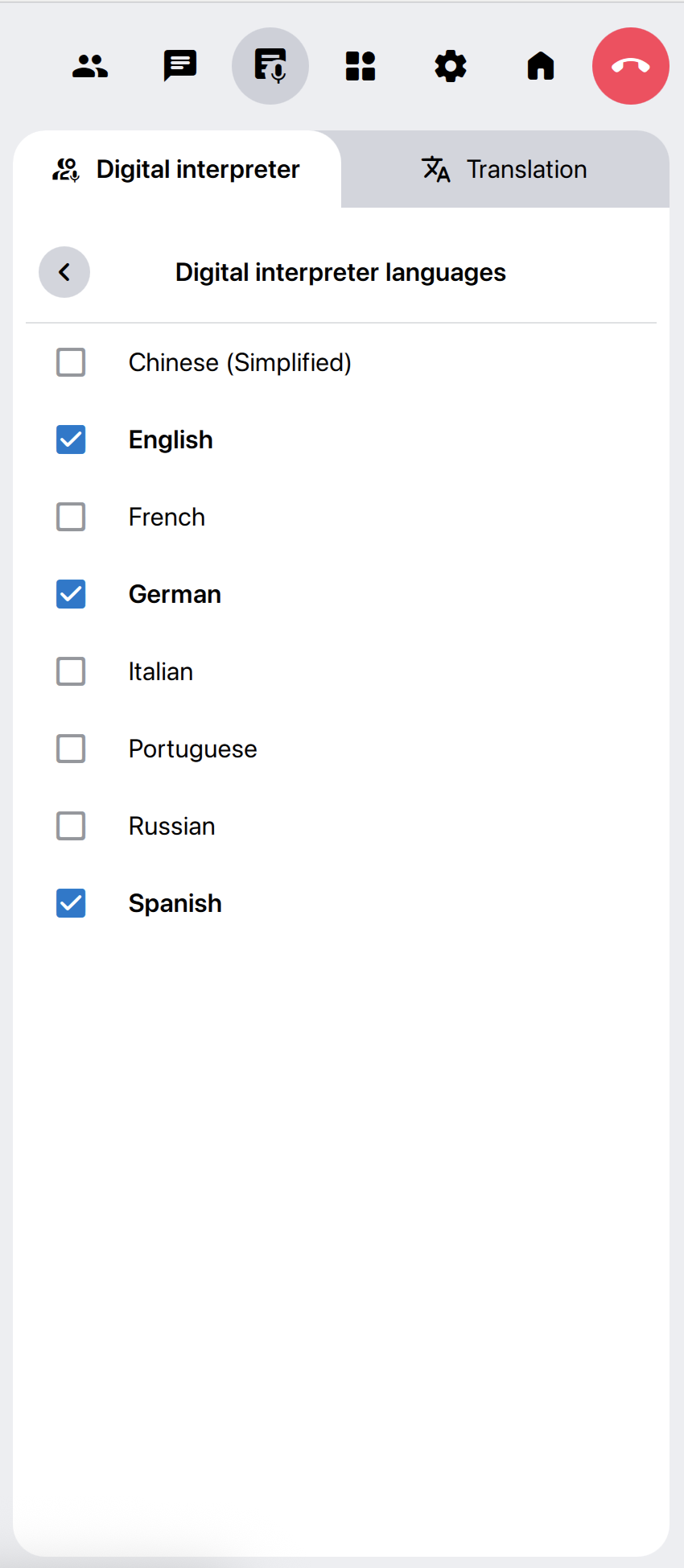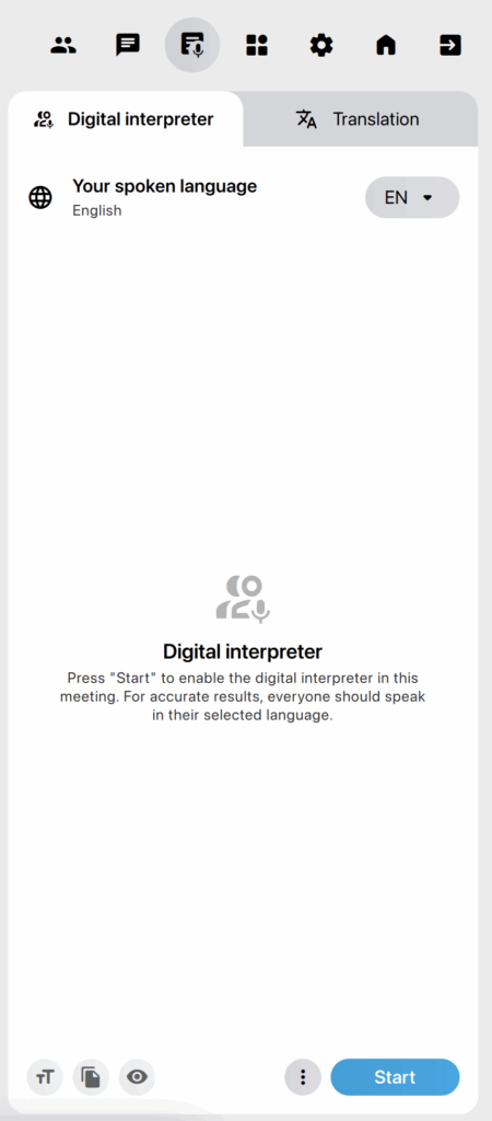 The Digital Interpreter helps participants who speak different languages to communicate with each other. All participants decide which language they speak. The digital interpreter automatically translates what is said into the chosen language.