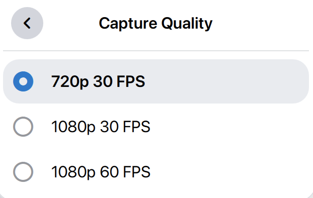Decide on the quality you want your video to be recorded in. You can choose between 720p 30 FPS, 1080p 30 FPS and 1080p 60 FPS.