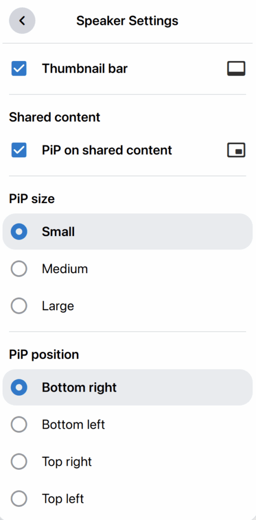 Use the Speaker settings to enable or disable the thumbnail bar and picture-in-picture on shared content. Do this by checking the box to the left of the respective setting. You can also change the size and position of the picture-in-picture display on shared content.