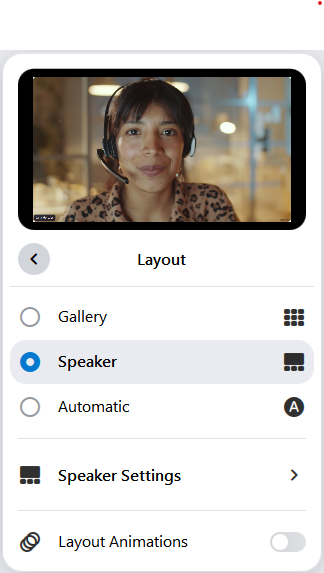 With the layout settings, you can decide on the appearance of your recording. You can display participants as a gallery or in speaker view. In addition, you have the option of selecting the Automatic setting. The preview is provided directly in the selection window.