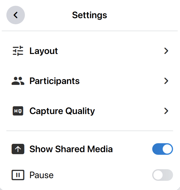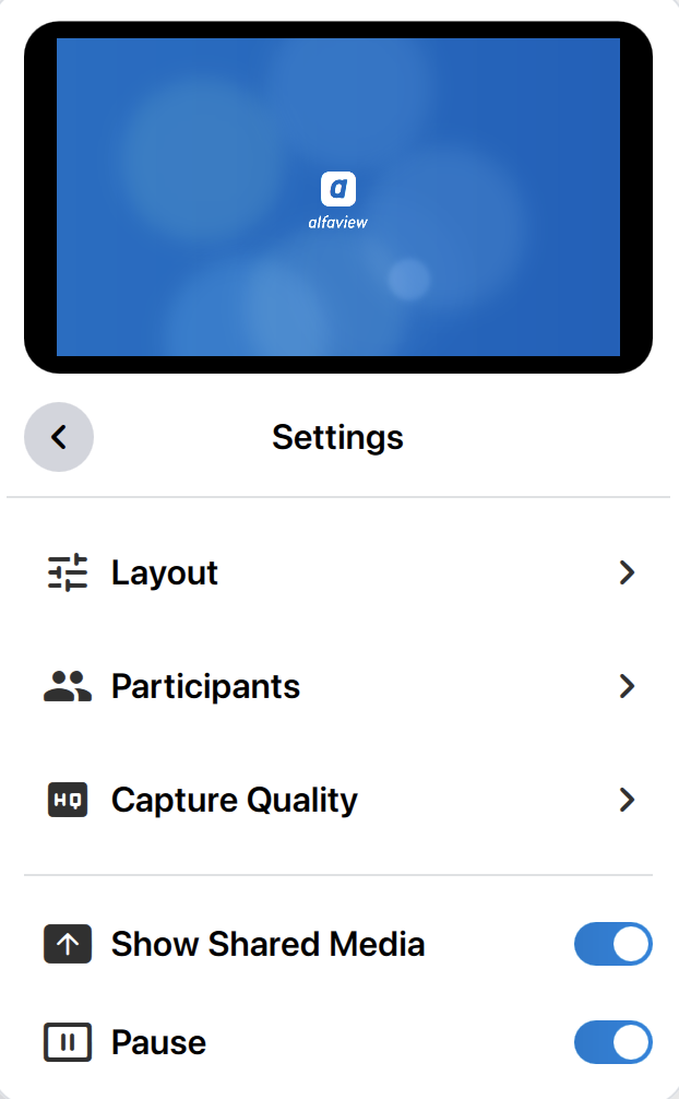 To pause the recording, select Pause in the settings. When the slider is displayed in blue, the function is active. During the pause, the video shows a blue background with the alfaview logo, and no sound is recorded. To end the pause, click on the slider again. The function is deactivated when the slider is displayed in grey again.