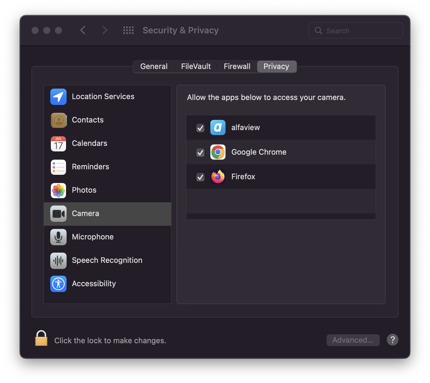 • To prevent access to the camera or microphone, the checkbox next to the icon of your preferred browser icon must be disabled.